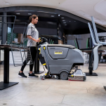 Kompaktowy design prowadzonej ręcznie szorowarki umożliwia operatorowi obserwację obszaru znajdującego się wokół urządzenia oraz zapewnia większą zwrotność nawet w przypadku wyjątkowo wąskich obszarów. Napęd na koła ułatwia użytkowanie, a także nie powoduje zmęczenia operatora podczas pracy.